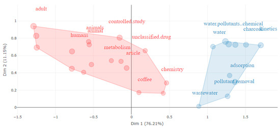 The analysis of the keyword was carried out with the Bibliometrix programme, resulting in 9718 words obtained from the titles, abstracts, and keywords of the publications. By applying a minimum threshold of five co-occurrences, the number of keywords was reduced to 936. Figure 5 displays the factorial correspondence analysis of the keyword. The outcomes reveal that the extracted terms can be grouped into two primary clusters. Cluster 1 (salmon colour) includes keywords such as “controlled study”, “human”, “animal”, “metabolism” and “chemistry”, which were included in work related to chemical hazards in coffee and their impact on consumers’ health. Cluster 2 (light blue colour), on the other hand, comprises words such as “adsorption”, “spent coffee grounds”, “contaminant removal” and “water pollutant”. These terms were used in research focusing on the problem of waste generated by the processing or consumption of coffee and the opportunities resulting from the reuse of these wastes as by-products.