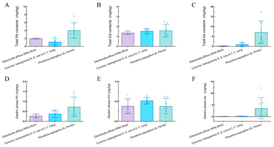 - Zuo, T.T.; Qu, H.R.; Jin, H.Y.; Zhang, L.; Luo, F.Y.; Yu, K.Z.; Gao, F.; Wang, Q.; Sun, L.; He, H.Z.; et al. Innovative health risk assessments of heavy metals based on bioaccessibility due to the consumption of traditional animal medicines. Environ. Sci. Pollut. Res. Int. 2020, 27, 22593–22603. [Google Scholar] [CrossRef] [PubMed]