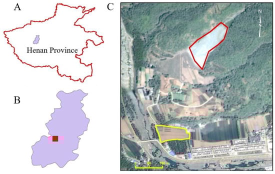 Field experiment location. (A) Location of Ruyang County (colored purple) in Henan Province; (B) map of Ruyang County (the experiment site location is painted in red); (C) details of the experimental site. The tailings were deposited (red outline) in a small valley on a slope. The experimental site (yellow outline) is located under the foot of the mountain (112.46° E 33.92° N).