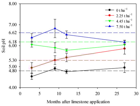 Limestone application significantly increased soil pH during a maize–wheat rotation in northern China after 3, 9, 12, and 27 months. The theoretical soil pH of each treatment, calculated by the liming rate model, was represented by corresponding dashed reference lines. The means ± standard deviation (n = 3) were shown. Statistical differences were denoted by lowercase letters using Tukey’s test at a significance level of p < 0.05.