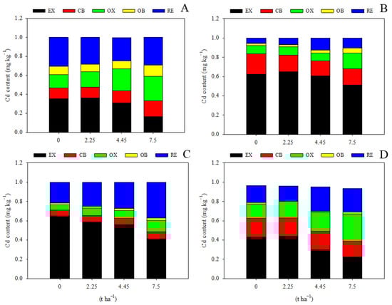 Limestone application had a significant impact on the speciation of Cd in the soil. With the exception of the treatment of 2.25 t ha−1 during the maize season, all other treatments led to a significant decrease in EX-Cd and an increase in RE-Cd, facilitating the transformation of soil Cd into a less bioavailable form (Figure 3). Application of 7.5 t ha−1 limestone resulted in a 53.6% reduction in EX-Cd, an 82.3% increase in OX-Cd, and a 39.5% increase in RE-Cd during the maize harvest season compared to levels observed two years prior during the maize season (Figure 3A), demonstrating the effectiveness of limestone. Interestingly, the content of RE-Cd did not show a significant response to limestone addition during the first maize growing season (Figure 3A), suggesting that a longer period of time is required for limestone to promote the transformation of soil Cd, as supported by data from the wheat season and the second maize season (Figure 3B–D). Moreover, it was observed that EX-Cd levels were relatively higher during the wheat maturation stage compared to maize, possibly due to seasonal variations in environmental conditions. Additionally, the levels of OX-Cd and OC-Cd were not significantly affected by the addition of limestone (Figure 3).