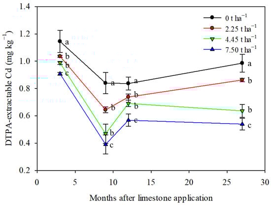 Limestone application had a significant impact on reducing the soil DTPA-extractable Cd content over a 27-month period (Figure 4). The control treatment showed fluctuations in soil DTPA-extractable Cd content, potentially influenced by seasonal variations or natural processes [42,43]. The addition of 4.45 and 7.50 t ha−1 of limestone notably changed the trend in soil DTPA-extractable Cd content compared to the control and 2.25 t ha−1 treatment. All limestone treatments effectively reduced the soil DTPA-extractable Cd content, demonstrating the long-lasting impact of limestone in controlling Cd bioavailability in the soil. The greatest reduction in soil DTPA-extractable Cd was observed with the application of 7.5 t ha−1 of limestone, resulting in a decrease of 20–54% after 3–27 months of limestone application (Figure 4). These results suggest that a single proper application of limestone can have a lasting effect for at least 27 months.