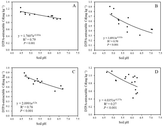 The relationship between pH and soil DTPA-extractable Cd: (A) after 3 months; (B) after 9 months; (C) after 12 months; and (D) after 27 months.