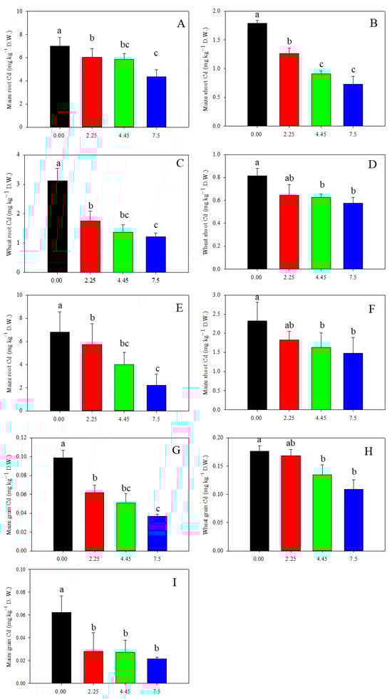 Limestone decreased wheat and maize Cd accumulation: (A,B,G) 3 months after limestone application; (C,D,H) 12 months after limestone application; and (E,F,I) 27 months after limestone application. Means ± S.D. (n = 3). D.W., dry weight. The lowercases indicate statistical significance by Tukey’s test, p < 0.05.