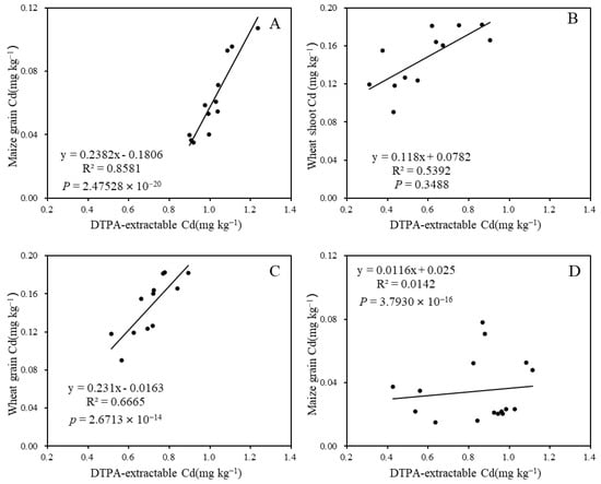 Correlation analysis between soil DTPA-extractable Cd and plant Cd content during various growth stages: (A) 3 months after limestone application; (B) 9 months after limestone application; (C) 12 months after limestone application; and (D) 27 months after limestone application.