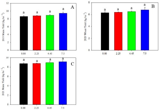 Cereal grain yield as affected by limestone addition: (A) maize yield in 2019; (B) wheat yield in 2020; and (C) maize yield in 2021. Data are shown as mean of three replicates ± S.D. Lowercase indicates significant statistical difference by Tukey’s test, p < 0.05.