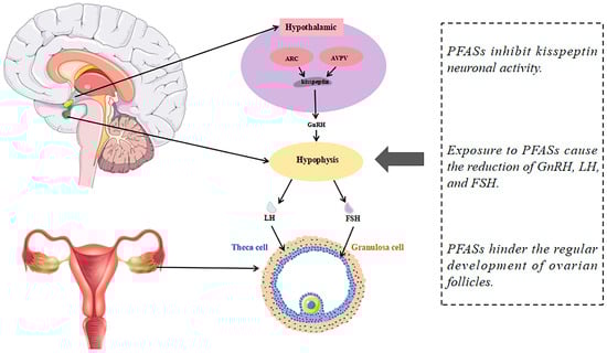 Kisspeptin promotes GnRH secretion by activating signaling pathways through its interaction with the Kisspeptin receptor (Kiss1r), thereby playing a critical role in regulating the hypothalamic–pituitary–gonadal (HPG) axis []. PFASs interfere with steroid hormones and synthesis and normal oocyte development by modulating the HPG axis (Figure 2). In a previous study, Du et al. used female neonatal rats of the Sprague–Dawley (SD) line subcutaneously injected with PFOA or PFOS at three different doses (0.1, 1, and 10 mg/kg/day) for 5 days (PND1~5 or PND26~30). Compared with the controls, Kiss1 and Kiss1r mRNA expression in the AVPV and hypothalamic arcuate nucleus (ARC) of post-pubertal adult rats was suppressed []. In another study, twelve-week-old female mice were divided into four groups, one of which was given PFOS (10 mg/kg) orally for 30 days. In comparison with the controls, reductions in progesterone (P4), GnRH, and LH were observed on the seventh day of PFOS exposure, with decreased levels of E2 and thyroxine (T4) detected on the fourteenth day. These changes may be attributed to significant decreases in the number of Kiss1 cells in the AVPV nucleus, as well as reductions in AVPV-Kiss1 mRNA (p < 0.01) and AVPV-Kiss1 protein levels (p < 0.05). Furthermore, the authors discovered that PFOS could inhibit the E2-induced surge in serum LH levels, further demonstrating that PFOS exposure directly inhibits E2-activated kisspeptin neurons in the AVPV, thereby suppressing the production of the LH surge []. The experiment demonstrated that chronic exposure to PFOS (0.1 mg/kg/day) in adult female rats inhibits the biosynthesis of E2 by reducing the expression of StAR mRNA, which is mediated by the decreased acetylation of histone H3K14, resulting in the decreased transport of cholesterol as an essential precursor for ovarian steroidogenesis [,].