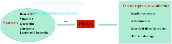 PFASs induce oxidative stress by inhibiting mitochondrial energy production, causing mitochondrial dysfunction []. Antioxidants can scavenge excess ROS, helping to maintain the body’s oxidative/antioxidant balance []. Emerging research suggests that adopting positive lifestyle modifications, such as antioxidants and anti-inflammatory nutrients, may help reduce the vulnerability to diseases caused by environmental pollutants []. The intake of some nutrients can reduce the damage caused by PFASs on the female reproductive system (Figure 3).