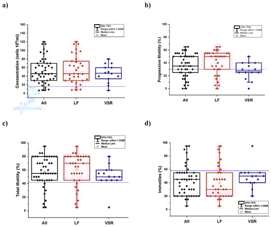 The data obtained by semen analysis carried out on the sample population living in Land of Fires (LF) and Valley of Sacco River (VSR) were first explored by descriptive statistics. Box and whisker plots have been used for all the seminogram parameters as a graphical representation to describe data distribution and skewness in both subgroups (LF, VSR) and whole (all = LF + VSR) sample population through simple dispersion and position indices. Box and whisker plots displaying the dispersion of sperm count and motility are shown in Figure 1, whereas those displaying sperm anomalies and round cell concentrations are shown in Figure S1. The box indicating the interquartile range (IQR, middle 50% of our population) within the 25–75% quartiles, the central tendency (median and mean), the whiskers extending to 1.5 IQR, and the outliers have been computed for each group of cases. In the plots for each seminogram parameter, the reference lines (blue lines) indicate the threshold value above or below which the parameter is in the normal range.