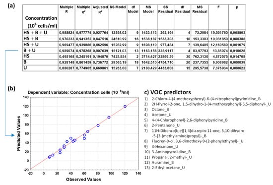 (a) Overall fit of the MLR model described by the test of the SS whole model vs. SS residual for sperm concentration (in 106/mL); (b) observed vs. predicted values for sperm concentration as a result of the MLR analysis for the data group B + U based on selected VOC predictors; (c) pattern of VOCs used as predictor variables in the MLR model as selected by a Pareto chart; the order in the list reflects the greatest predictive contribution to the model (VOC name_X; X = B, blood, U, urine, or HS, human semen). Notation for numeric values: comma “,” is the decimal separator (SI).