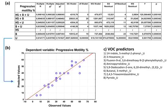 (a) Overall fit of the MLR model described by the test of the SS whole model vs. SS residual for sperm progressive motility (in percentage); (b) observed vs. predicted values for sperm progressive motility as a result of the MLR analysis for the data group U based on selected VOC predictors; (c) pattern of VOCs used as predictor variables in the MLR model as selected by a Pareto chart; the order in the list reflects the greatest predictive contribution to the model (VOC name_X; X = B, blood, U, urine, or HS, human semen). Notation for numeric values: comma “,” is the decimal separator (SI).