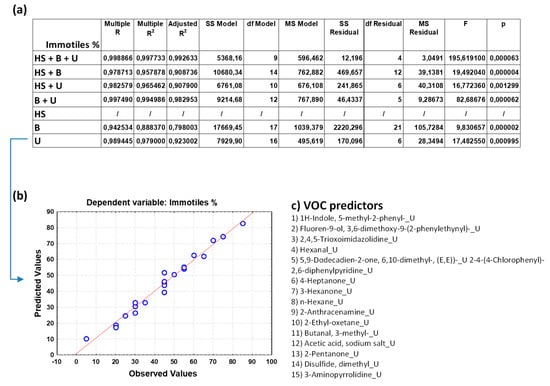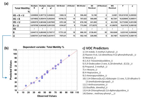 (a) Overall fit of the MLR model described by the test of the SS whole model vs. SS residual for sperm immotiles (in percentage); (b) observed vs. predicted values for sperm immotiles as a result of the MLR analysis for the data group U based on selected VOC predictors; (c) pattern of VOCs used as predictor variables in the MLR model as selected by a Pareto chart; the order in the list reflects the greatest predictive contribution to the model (VOC name_X; X = B, blood, U, urine, or HS, human semen). Notation for numeric values: comma “,” is the decimal separator (SI).