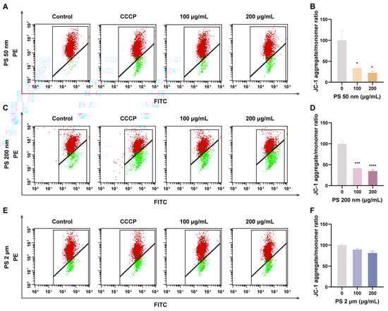 HTR-8/SVneo cells were seeded in 6-well plates at a density of 6 × 105 cells/well and exposed to 0, 10, 50, 100, and 200 μg/mL PS-MNPs for 24 h. Cells were subjected to treatment with CCCP at a concentration of 1:1000 for a duration of 20 min, serving as the positive control group. The Mitochondrial membrane potential (MMP) of cells was detected using the Mitochondrial membrane potential assay kit with JC-1 (C2006; Beyotime, Shanghai, China). Following cell collection, the cells were incubated with JC-1 staining working solution at 37 °C in the cell culture incubator for 20 min. The cells were subsequently washed twice with 1x JC-1 dye buffer and filtered through a membrane filter. The fluorescence intensities were analyzed using an LSRFortess flow cytometer (BD Bioscience, Franklin Lakes, NJ, USA).