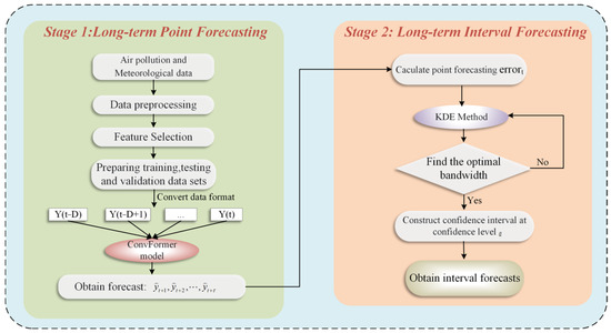 This study proposes a prediction framework based on the ConvFormer-KDE model, which combines CNN, Transformer, and KDE techniques to obtain long-term point and interval prediction for PM2.5 concentration. In selecting influencing factors, some meteorological factors and other pollution factors cannot be ignored. Therefore, PM10, CO, O3, wind speed, temperature, pressure, and wind direction, which are highly correlated to PM2.5, were included in the modelling of this study. In addition, PM2.5 values from stations that were strongly correlated with the target station were used as input to the model. In the modelling process, unlike previous studies where the final prediction results are obtained after integrating the prediction results of two separate models, this study converts the CNN-extracted features into the input dimensions required by the Transformer model. Subsequently, the Transformer is utilized to mine the long-term dependencies in the time series to obtain the prediction results. The ConvFormer-KDE takes full advantage of different deep-learning modules. CNN is able to learn temporal relationships and interactions between multivariate variables, and the multi-attention mechanism of the Transformer enables the model to track each data point in relation to another specific data point, allowing it to capture long-term dependencies between temporal sequences. In terms of output strategy selection, this method employs direct output of multiple predicted duration values simultaneously rather than recursively training multiple models. The key to recursive multistep prediction methods lies in continuously updating the dataset and utilizing the updated dataset to make predictions. These methods have the problem of error accumulation becoming worse as the prediction time increases, since each prediction builds on the previous one. The direct multi-output approach chosen in this study can alleviate this problem, and the model structure is simpler and more efficient in terms of computational efficiency.