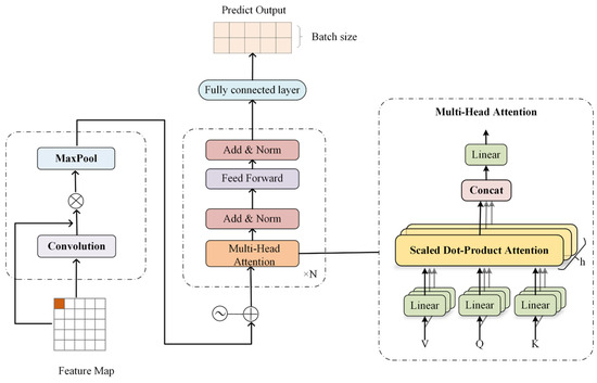 where , , denote the query vector, key vector, and value vector, respectively, denotes the dimensionality of the key, and is the activation function that transforms the input to the interval [0, 1]. The self-attention mechanism derives the attention weights by evaluating the similarity between the query and the keys, and it produces the final representation through a weighted sum.