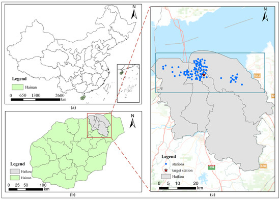 Study area and spatial distribution of air monitoring stations: (a) The green part is the boundary map of Hainan province, (b) The gray part is the boundary map of Haikou city, (c) Distribution of air monitoring stations in Haikou (zoom figure).