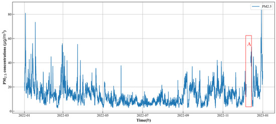 Figure 4 depicts the hourly PM2.5 concentration sequence from the target station in 2022. The figure shows that the PM2.5 concentration exhibited significant volatility and instability. Notably, a continuous missing value was evident, represented by the red mark labeled A in the figure. Data gathering can be hindered by problems including equipment breakage and transmission faults, which can result in outliers and missing results. These missing values can negatively affect the prediction of PM2.5 concentration. Thus, preprocessing was necessary before constructing the prediction model. The forward filling method was specifically employed to address missing values within short time periods (e.g., up to 4 h) in the original data. For medium and long time periods (e.g., more than 4 h but less than 72 h), the multiple interpolation method was utilized to fill in the missing values. However, missing values in long time periods (e.g., exceeding 72 h) were simply deleted and handled accordingly. In order to eliminate the effect of magnitude between different features, a normalization method was finally used to scale the data within the values (0, 1).