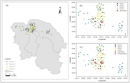 The hierarchical clustering method and POI data were employed to cluster all 95 monitoring stations, resulting in four distinct clusters, as illustrated in Figure 5. The stations in Cluster 1 and Cluster 3 were located in the city center, characterized by dense architectural facilities, such as prominent urban structures such as commercial buildings, cultural institutions, and retail centers. The stations in Cluster 2 were located in the outside region, predominantly flanked by educational institutions and recreational areas. The stations in Cluster 3 were located in central locations, with a convergence of various activity facilities nearby. According to the clustering results, it was observed that the target monitoring station (S9) was part of Cluster 1. The stations in Cluster 1 underwent additional refinement to identify those that correlated with the target station, in conjunction with spatial variability analysis. Figure 5c illustrates the selection of stations that were highly correlated, such as S2, S3, S8, S39, and S45. Ultimately, the model’s prediction was informed by the PM2.5 concentrations from these stations that were highly correlated.