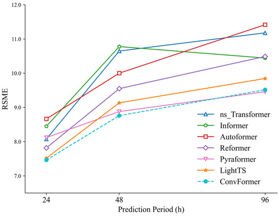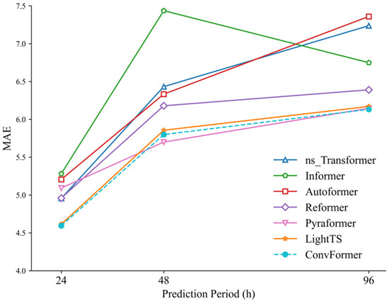 To verify the effectiveness of ConvFormer for long-term prediction of PM2.5, this study analyzed the predictive performance of six baseline models (ns_Transformer [54], Informer [55], Autoformer [56], Reformer [57], Pyraformer [58], and LightTS [59]) in comparison with the proposed approach, validating its effectiveness. These baseline models currently achieve good results in long-term series prediction tasks. Comparison with these models enabled a better assessment of the performance advantages of the ConvFormer model in the task of long-term prediction of PM2.5.