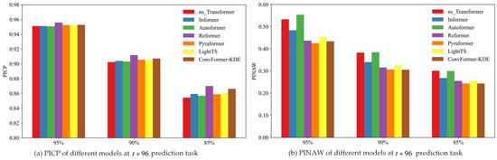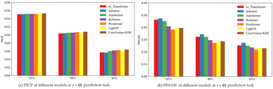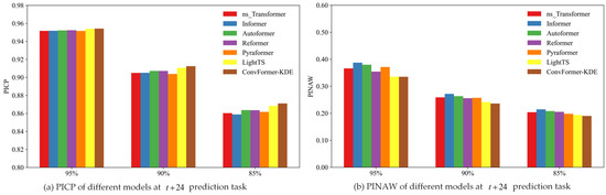 In order to compare the interval-prediction effectiveness of different models based on the KDE method, this study compared the interval-prediction results of different models using the same training set and test set. The experimental results are summarized in Table 4. For the various point-prediction models, the PICP of all models exceeded the preset confidence level at different confidence levels and prediction times. Figure 10, Figure 11 and Figure 12 depict the PICP and PINAW values for each model under different prediction t tasks. Specifically, the ConvFormer-KDE model achieved the highest PICP and the lowest PINAW in the prediction task at the same confidence level. PICP measures the proportion of actual observations in the prediction interval, typically ranging from 0 to 1, with values closer to 1 indicating more accurate predictions that cover more actual observations. PINAW measures the width of the prediction intervals. Combining PICP and PINAW can assess the overall performance of interval prediction. As a result, in the prediction task, the ConvFormer-KDE demonstrated the best performance, making it able to provide more accurate PM2.5 information for the public and air pollution prevention workers. In the and prediction tasks, the ConvFormer-KDE also achieved relatively high PICP and PINAW. It is worth noting that while the Reformer ranked in the middle of all models in terms of predictive performance in the point-prediction task, it achieved the best PICP values at all confidence levels in the interval-prediction task. However, it did not have the lowest PINAW. This suggests that the Reformer model was overly conservative in the prediction task, resulting in extensive prediction intervals. Although this ensured a high PICP, the prediction uncertainty remained high. Therefore, overall, the ConvFormer-KDE demonstrated the best interval-prediction performance.