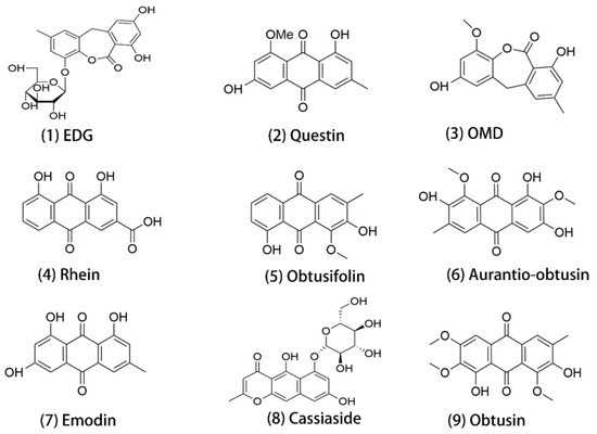- Dong, X.; Fu, J.; Yin, X.; Yang, C.; Zhang, X.; Wang, W.; Du, X.; Wang, Q.; Ni, J. Cassiae semen: A review of its phytochemistry and pharmacology (Review). Mol. Med. Rep. 2017, 16, 2331–2346. [Google Scholar] [CrossRef]