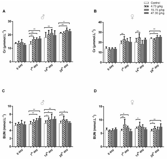 CSAEs increased serum Cr and BUN levels in rats. Male and female SD rats were treated with CSAEs (4.73, 15.75, and 47.3 g/kg/day) for 7–−28 days. Serum was collected after the final treatment at each time point. (A,B) Serum Cr levels in male (A) and female (B) rats; (C,D) serum BUN levels in male (C) and female (D) rats. * and ** indicate p < 0.05 and p < 0.01, respectively, when compared with the vehicle control rats; n = 8 in each sex.