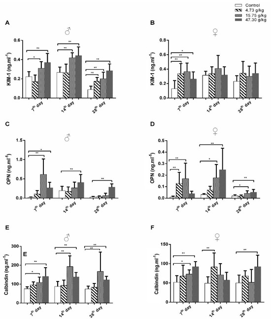CSAEs increased urinary KIM−1, OPN, and calbindin protein levels in rats. Male and female SD rats were treated with CSAEs (4.73, 15.75, and 47.3 g/kg/day). Urine was collected after the final treatment on days 7, 14, and 28. (A,C,E) Levels of KIM−1, OPN, and calbindin in male rats; (B,D,F) results of the female rats. * and ** indicate p < 0.05 and p < 0.01, respectively, when compared with the vehicle control rats; n = 8 in each sex.