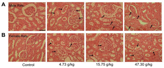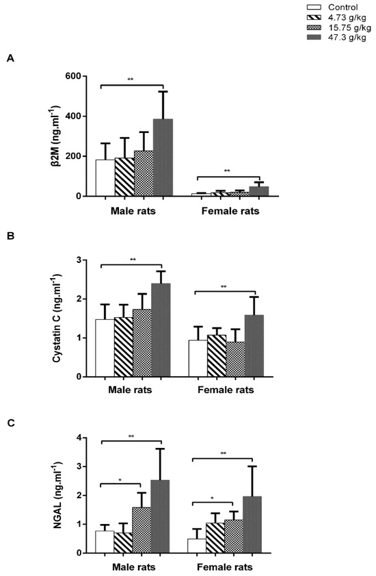 We further determined the urinary levels of β2M, cystatin C, and NGAL on day 28 of CSAEs treatment. Results showed that treatment of CSAEs, particularly at the highest dose (47.30 g/kg), caused obvious increases in the levels of these three marker proteins in both male and female animals (Figure 4). Interestingly, we noted a significant difference in the urinary β2M levels between male and female rats at basal and CSAEs-treated conditions, while there was no such difference for cystatin C and NGAL proteins (Figure 4). Tsuji et al. compared the urinary biomarker excretion levels between male and female rats at 5, 7, 9, and 12 weeks of age, and revealed higher excretion levels of β2-microglobulin (β2-MG) in male rats than female rats [23], in line with our findings. Despite such sex differences in absolute amounts, both male and female rats showed the same pattern, but with changes by different extents in nephrotoxicity markers after the administration of CSAEs. Together, these data demonstrate that high doses of CSAEs treatment cause renal damage as early as day 7 in both male and female rats.