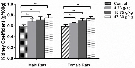 As presented in Figure 5, compared to the control group, the organ coefficients of the kidneys were significantly increased in all treatment groups of both male and female rats. These increased approximately 25% in male and female rats treated with the highest dose (47.30 g/kg) of CSAEs.