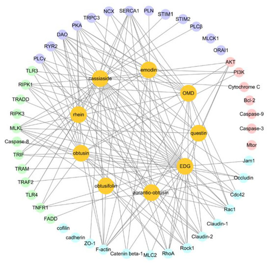 We first explored the effects of Cassiae semen on regulating the actin cytoskeleton using molecular docking. The results indicated that the components in Cassiae semen are more likely to directly regulate the actin cytoskeleton through interaction between the key proteins in the RhoA–ROCK pathways, especially the proteins F-actin, Rac1, ROCK1, and occludin. The RhoA–ROCK signaling has been extensively investigated since it is critically involved in cell growth, differentiation, migration, cell contraction, adhesion, inflammation, and survival from apoptosis [30,31]. Rho GTPases act as molecular switches in the cell by cycling between the inactive GDP-bound state and the active GTP-bound state. The activation of RhoA stimulates ROCK, the downstream effector that phosphorylates LIM kinase (LIMK), myosin light chain (MLC), and cofilin, subsequently impacting some cellular processes [32], such as actin cytoskeleton remodeling, cell adhesion and migration, reactive oxygen species (ROS) formation, and cell apoptosis [33]. A study showed that inactivation of the Rho–ROCK1 pathway was associated with significant improvement in proteinuria and tubulointerstitial fibrosis, and could affect kidney function in small congenic regions (e.g., RBF and GFR) [34]. Another study revealed that in canine kidney cells, apoptosis could be induced through mitochondrial malfunction and cytoskeleton disassembly [21].