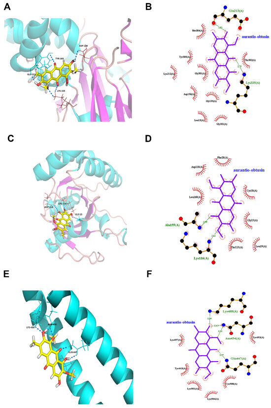 Molecular docking of aurantio-obtusin into the active sites of human F-actin (A,B), Rac1 (C,D), and occludin (E,F). The 3D structure is shown in panels (A,C,E), while the 2D structure is shown in panels (B,D,F).