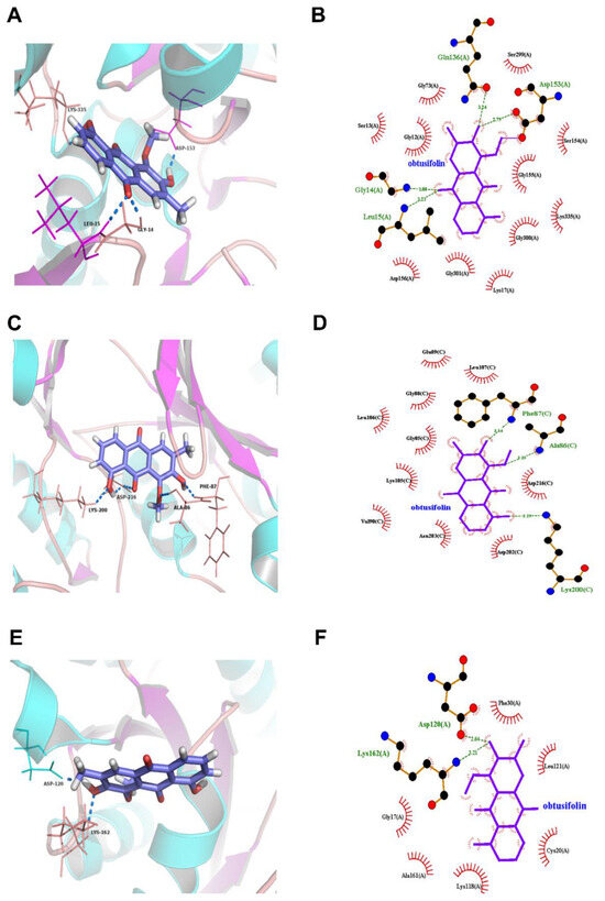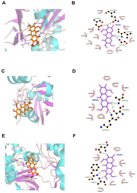 Molecular docking of obtusin into the active sites of human F-actin (A,B), Rac1 (C,D), and Rock1 (E,F). The 3D structure is shown in panels (A,C,E), while the 2D structure is presented in panels (B,D,F).