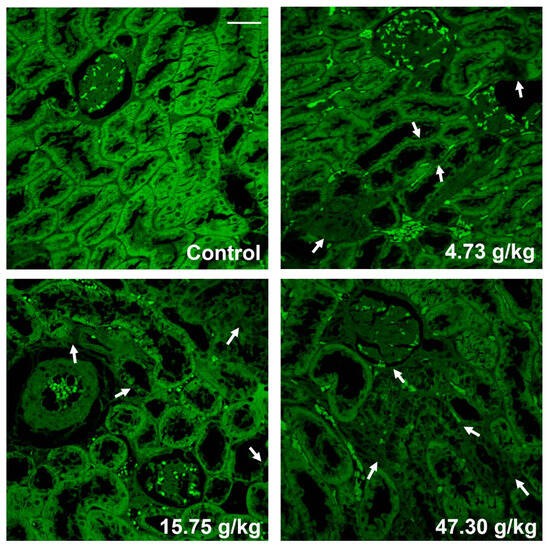 Kidneys embedded in paraffin were sliced into sections of 4 μm thickness, deparaffinized and hydrated, and then rinsed in distilled water and phosphate-buffered saline (PBS) 3 times. Tissue sections were incubated in 0.5% Triton X-100 for 30 min to allow permeabilization and then with green fluorescent phalloidin conjugate for 1 h followed by rinsing with 1× PBS. Images were recorded using a confocal laser-scanning microscope (Nikon, Tokyo, Japan) with an FITC emission filter (488/520 nm).