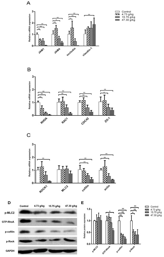 To elucidate the molecular mechanisms mediating F-actin disruption by CSAEs, we focused on the RhoA–ROCK pathway, since cytoskeleton formation is partially controlled by the activity of this pathway and our in silico analyses suggested possible interactions between CSAEs and regulatory proteins of this pathway. Actin filament assembly/disassembly can be regulated by cofilins that integrate transmembrane signals to coordinate the spatial and temporal organization of actin filaments [24]. These transmembrane signals mainly involve cell–cell junctions, such as ZO-1, occludin, claudin, and JAMs [25]. As expected, the mRNA expressions of RhoA, Rac1, ROCK1, actin, cofilin, CDC42, ZO-1, and JAM1 were significantly and dose-dependently downregulated in renal tissues of rats treated with higher doses of CSAEs (15.75 and 47.30 g/kg) (Figure 12A–C). Similar effects were also observed in JAM4 and occludin mRNA expression, despite their mRNA levels being significantly induced in rats treated with low-dose CSAEs (4.73 g/kg), and the expression of claudin-1 mRNA was also stimulated by CSAEs (Figure 12A).