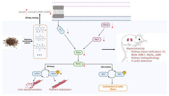 In conclusion, we demonstrated that Cassiae semen can cause nephrotoxicity after 28 days of repeated administration in rats and that the potential action mechanisms were the abnormal structure of glomeruli and tubules, especially tubules, which manifested as the disappearance of F-actin (Figure 13). Taking together the results of molecular docking and the nephrotoxicity mechanism, Cassiae semen impacts actin cytoskeleton depolymerization and filament stabilization by interacting with the RhoA–ROCK pathway and/or directly binding to F-actin.
