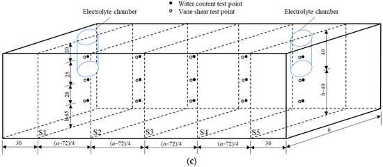 The daily working hours of each test were 12 h. Intermittent time was not included in the test results. During the experiment, the variations in current and electric potential in the soil were monitored using a multimeter every 2 h, and the volume changes of the anolyte and catholyte were monitored every hour. The electrolytes were refreshed one time per day. The replaced electrolyte was stored, and its pH was tested using a precision pH test paper. After each test, the shear strengths and moisture contents were tested according to the test point layout diagram shown in Figure 1c. These test points were distributed on five cross-sections (S1–S5) with different depths. The shear strength tests conforming to ASTM 2001 were conducted using a dynamoelectric vane shear (TT-LVS, manufactured by Zhejiang Geotechnical Instrument, Shaoxing, China). The vane shear apparatus had blades that were 25.4 mm in diameter, 25.4 mm in height, and 0.01 mm in thickness. The shear stress and rotation angle were automatically recorded.