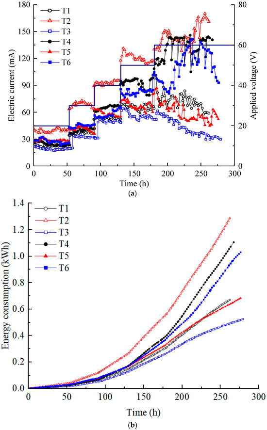 The energy consumption variations in each test are shown in Figure 2b. The total energy consumption of each test was small for the laboratory model test size. The energy consumption was the highest for T2, followed by T4 and T6. T1 and T5 had similar energy consumption, while T3 had the lowest energy consumption. In the proposed electrical scheme, variations in energy consumption are primarily influenced by changes in current. After 130 h, once the voltage reached 50 V, the energy consumption of each test increased almost linearly at a relatively high rate.