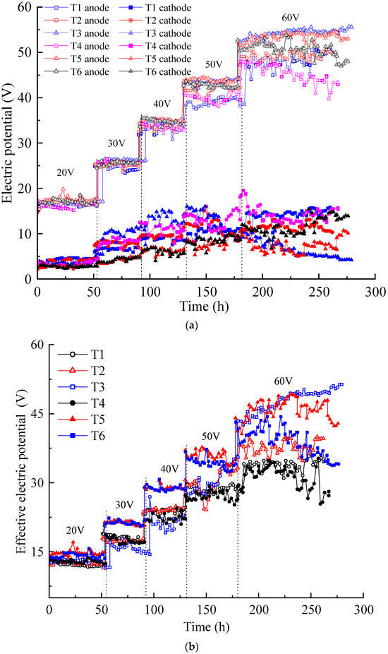 Figure 3b illustrates the variation in the effective electric potential of each test during the EKR process. The effective electric potential in each test increased with the increasing of the applied voltage. Under the voltages of 20–50 V, the effective electric potential of T1–T4 was relatively close and lower than those of T5 and T6. When the voltage rose to 60 V, evident differences were observed in the effective electric potential in each test. The effective electric potential of T3 gradually surpassed those of other experiments and maintained a good upward trend, while T4–T6 showed a downward trend. An increase in the effective electric potential of T3 at an output voltage of 60 V may be due to electrode polarization.