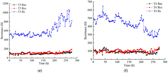 Resistance variation of anolyte, catholyte, and soil in each test: (a) T1; (b) T2; (c) T3; (d) T4; (e) T5; (f) T6.