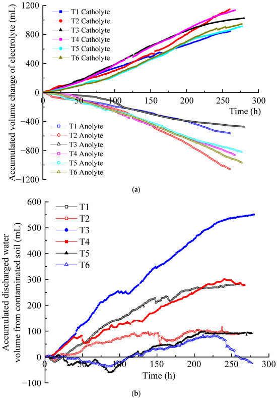 The migration of hydrated cations in the soil pore fluid to the cathode formed electro-osmotic flow under the action of an electric field. It is an important factor affecting the removal efficiency of EKR [27,28]. The accumulated volume changes of the anolyte and catholyte of T1–T6 are shown in Figure 5a. The difference between the accumulated volume increase in catholyte and the accumulated volume decrease in anolyte at the same time is the accumulated volume of discharged water from the contaminated soil, as shown in Figure 5b. It can be seen that in each test, the accumulated volume of the catholyte increased approximately linearly, whereas that of the anolyte decreased approximately linearly.