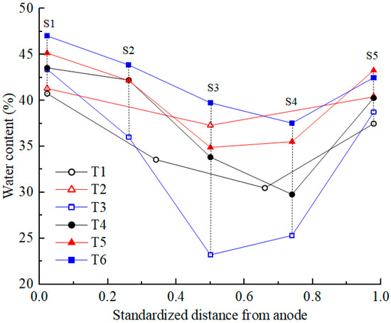 After EKR treatment, soil water content was tested according to the testing point layout diagram shown in Figure 1c. The testing points were distributed at the surface, middle, and bottom positions of the five cross-sections (S1–S5). The average moisture content of each section was calculated, and its distribution is shown in Figure 6. Due to the development of cracks on the soil surface in T1 and T2, the measurement points deviated from their original positions. Compared with the initial moisture content, the moisture content of all soil sections after treatment decreased to varying degrees. For T4 and T6, the moisture content decreased from the S1 to S4 sections and increased at the S5 section. For the other four experiments, the moisture content decreased from the S1 to S3 sections and increased from the S4 to S5 sections. The position with the highest water discharge from the polluted soil was at the center between the two electrodes and leaned toward the cathode. It is mainly due to the fact that the pore water pressure of the soil in the middle of the test device is the smallest and that the electro-osmotic flow migrated toward the cathode. S1 and S5 were the cross-sections where the centers of the anolyte and catholyte chambers were located, respectively. Due to the direct contact between the soil surface of the S1 and S5 sections and the electrolyte, the moisture content of the soil was relatively high, with the former being higher than the latter.