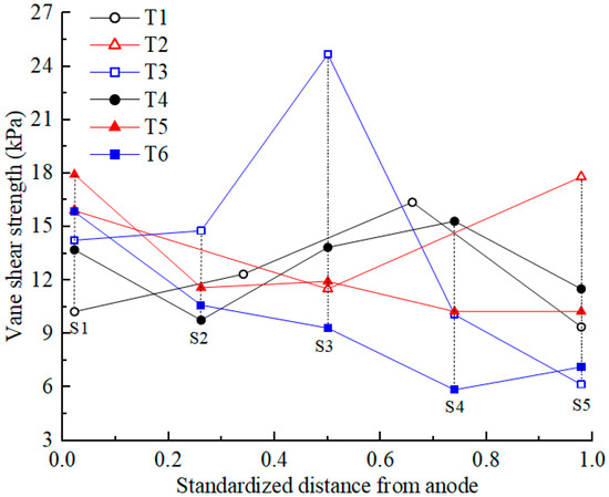 Shear strength is an important mechanical property of soil. After EKR treatment, the shear strength of the soil was first tested according to the testing point layout diagram shown in Figure 1c. The average shear strength at each section was calculated, and its distribution is shown in Figure 7. The initial shear strength of the contaminated soil was approximately 0. After EKR treatment, the shear strength of the soil varied from 6 to 26 kPa, indicating that EKR can improve the mechanical properties of contaminated soft clay, but the degree of improvement is limited. The factors that affected the shear strength of a certain section in each experiment were mainly related to drainage consolidation and chemical reinforcement at that location.