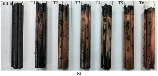 The results under different optimization parameters are compared in Table 4. The average removal rates of the heavy metal Zn in T1–T6 were 63.9%, 83.5%, 64.3%, 78.8%, 78.2%, and 75.2%, respectively. The average Zn removal rate in T2 was the highest. After comprehensive analysis, it was found that the main factor determining the removal rate of heavy metal Zn is the volume reduction of the anolyte. The volume reduction of the anolyte in T2 was the largest, while that in T1 and T3 was the smallest. The removal rates of the heavy metal Zn also exhibited the same magnitude correlation. The volume reduction of the anolyte represents the migration intensity of the electro-osmotic flow in the EKR system. A higher volume reduction of the anolyte is always associated with a higher Zn removal rate. The average removal rates of heavy metal Cu in T1–T6 were 27.9%, 67.0%, 74.0%, 53.4%, 75.9%, and 85.5%, respectively. The precipitation of Cu on the cathode surface after each test is shown in Figure 8c. The average Cu removal rate in T6 was the highest. After comprehensive analysis, it was found that the main factors affecting the Cu removal rate in sequence were the effective electric potential of the soil and the electrolyte concentration. The lower average Cu removal rates in T1 and T4 were due to Cu accumulation in the soil near the catholyte chamber. This is related to the relatively low effective electric potential of the soil in both experiments. Although the electrolyte concentration of T4 was 1.0 mol/L, it could not be further improved. When the applied voltage of the power supply was 20–50 V, there was not much difference in the effective electric potential of soil between T5 and T6. When the applied power supply voltage was 60 V, the effective electric potential of the soil in T5 was higher than that in T6. However, the high electrolyte concentration of T6 resulted in a higher Cu removal rate than T5. T3 maintained a high soil effective electric potential under a 60 V output voltage; thus, its Cu removal rate was ranked third, followed by T2.