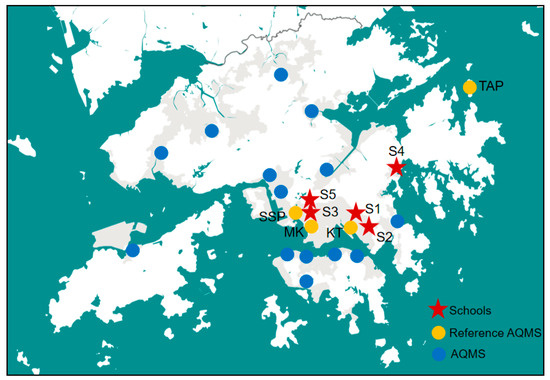Five schools (S1, S2, S3, S4, and S5) were under air quality investigation during high pollution episodes occurring in Hong Kong in September of 2017. S1 is built on a hill about 15 m above a secondary road in the Kwun Tong (KT) area of Hong Kong. There is a parking lot in service nearby. S2 is also located on a hill about 20 m above a secondary road in the KT area. It is surrounded by high-rise residential buildings. S3 is situated in the Kowloon area, and it is built next to a railway line. S4 is also located on a hill in a rural area of Hong Kong, and it is away from any heavily trafficked roads. S5 is in a residential area in Kowloon in Hong Kong, and it is in close proximity to secondary roads. The locations of the investigated schools as well as the nearby AQMSs are indicated in Figure 1.