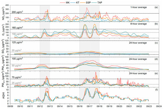 Temporal variation in (a) NO2, (b) O3, (c) SO2, (d) PM10, (e) PM2.5 concentrations and (f) AQHIs measured by MK roadside AQMS, KT community AQMS, SSP community AQMS, and TAP background AQMS during the period from 10:00 9 September to 23:59 22 September 2017. The shaded parts indicate high pollution episodes. The gray dashed lines represent the 2005 WHO air quality guidelines and the black dashed lines indicate the 2014 HKEPD air quality guidelines.