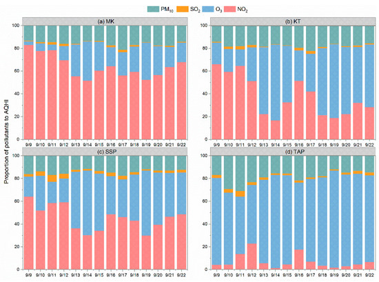 Contribution of NO2, O3, SO2, and PM10 to the AQHI on a daily basis calculated from the sampling data of (a) MK roadside AQMS, (b) KT community AQMS, (c) SSP community AQMS, and (d) TAP background AQMS.