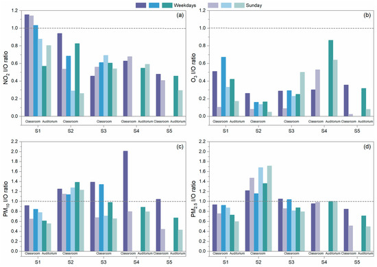 I/O ratio of (a) NO2, (b) O3, (c) PM10, and (d) PM2.5 calculated from the data collected only during the school time of each investigated school and compared between weekdays and Sundays. S1 has two classrooms (in purple and blue) and one auditorium (in green); S2 and S3 both have three classrooms (in purple, blue, and green); and S4 and S5 both have one classroom (in purple) and one auditorium (in green). Dark purple, blue, and green colors represent the I/O ratio on weekdays; light purple, blue, and green colors represent the I/O ratio on Sundays. The gray dashed lines indicate that the indoor concentration levels are equal to the outdoor ones.