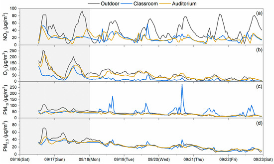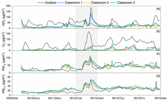 Temporal variation in (a) NO2, (b) O3, (c) PM10, and (d) PM2.5 measured at the indoor and outdoor sites of S5. The shaded part indicates a high pollution episode.