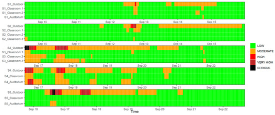 Indoor and outdoor AQHIs of schools were all calculated hourly using the 3 h moving average data of NO2, O3, and PM10 concentrations, which are visualized in Figure 10 by the AQHI’s corresponding colors indicated by the HKEPD. Green represents an AQHI of 1–3; orange equals to an AQHI of 4–6; red indicates an AQHI of 7; brown is an AQHI in the range of 8–10; while black means the AQHI is even higher than 10. It is apparent that the high pollution episodes also influenced the school outdoor environments, though specific outdoor AQHI values at S1, S2, S4, and S5 may be one or two indexes lower than those released by the reference AQMSs. This is mainly due to the lower concentration levels of NO2 and O3 at some school sites. In most investigated indoor environments of schools, the indoor AQHI was in low and moderate levels. This may be driven by the partial reduction in NO2 concentrations and the greater removal of O3 pollution during the infiltration process from outdoors to indoors in summertime when air conditioning is operated. Only one auditorium of S4 experienced an indoor AQHI at high and very high levels, which was likely driven by the high penetration of O3 pollution under largely open ventilation conditions. It is important to remember that this study was conducted when air conditioning was in use. It is possible that different conditions might be found for indoor environments during cooler seasons when natural ventilation is more commonly used. Doors and windows are often left open for better air circulation during class time during these periods.