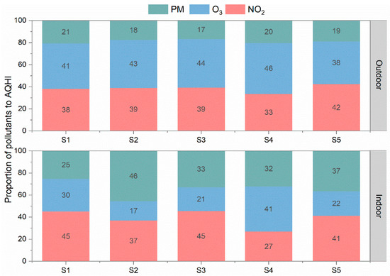 The contributions of NO2, O3, and PM10 pollutants to the outdoor AQHI and indoor AQHI were summarized for each school through the entire monitoring period and are displayed in Figure 11. For the outdoor AQHI calculated from the school monitoring, the proportions of NO2, O3, and PM10 contributions matched with those of the urban AQMS sites, where OX accounted for 80% while PM10 covered the remaining 20%. However, in the indoor environments we studied during the summertime, the contribution from PM10 increased to more than 30% in S3, S4, and S5 and the maximum was about 46% in S2. Higher indoor particle concentration levels than outdoor levels were observed under both mechanical ventilation and natural ventilation, even in the absence of student activities. This implies that more care should be paid to indoor particle pollutions. Actions are needed to reduce indoor PM, which might include improved room cleaning and perhaps added filtration.